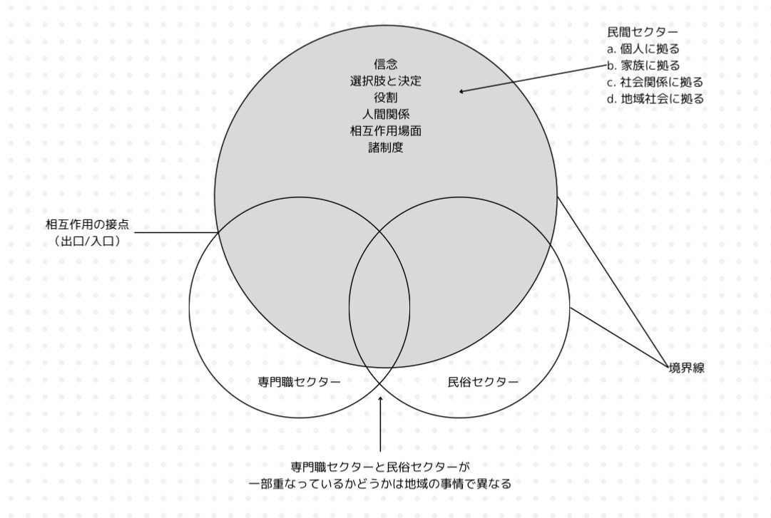 ↓はアーサー・クラインマンという精神科医の方が「臨床人類学 ; 文化のなかの病者と治療者」という本で示したヘルスケアシステムのモデル図になるんですが、不調があった時に普段は民間の中で相談が行われ、必要に応じて専門職に関わるような形を提唱しています。