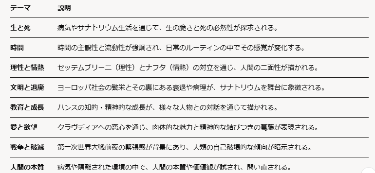 「魔の山」が扱っているテーマをGrokさんにまとめてもらったところ、以下のようになりました。